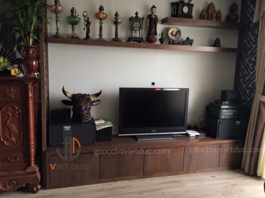 Kệ tivi gỗ óc chó được thiết kế theo phong cách hiện đại, kiểu dáng đơn giản, đường nét thanh thoát, không có quá nhiều chi tiết cầu kỳ, phía trên chưng bày nhưng đò vật nhỏ không tạo sự nhàm chán cho bức tường phía sau.