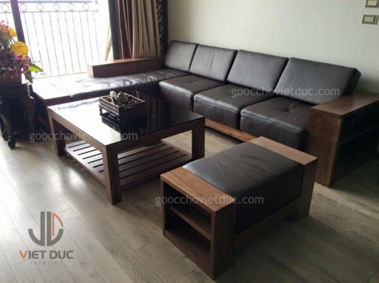 Bộ sofa gỗ óc chó cao cấp bọc da với khung gỗ tự nhiên. Sofa gỗ óc chó với thiết kế đa năng, tận dụng gầm ghế và tay vịn làm nơi đựng đồ hiện quả.
